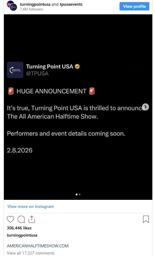 Although TPUSA is known for its political activism, the organization insists the All-American Halftime Show is not about partisanship. Instead, it’s framed as a cultural moment designed to bring hope, pride, and positivity to audiences who want to see something different.